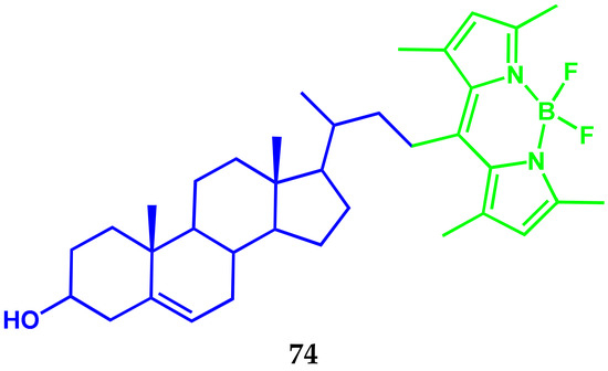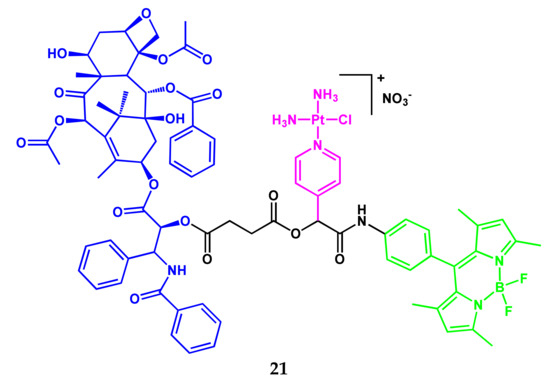 A three-component amphiphilic conjugate 21 (Scheme 12) containing BODIPY-fluorophore, paclitaxel, and a platinum compound was presented in [17]. The conjugate could self-assemble into spherical nanoparticles with high stability in aqueous solution.