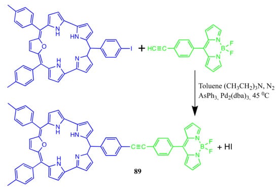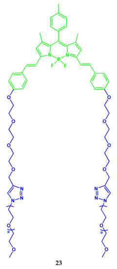 Amphipathic polymer photosensitizer PEG-BODIPY (as a carrier, drug self-delivery system) 23 was synthesized (Scheme 14) for combined chemotherapy and photodynamic anticancer therapy with a real-time tracking property [19].