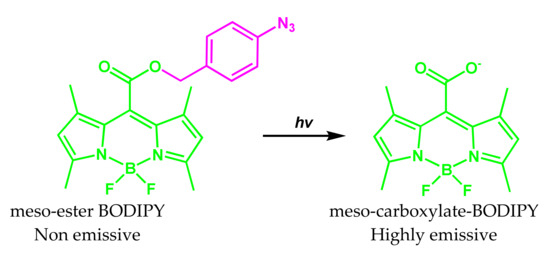 - Wijesooriya, C.S.; Peterson, J.A.; Shrestha, P.; Gehrmann, E.J.; Winter, A.H.; Smith, E.A. A Photoactivatable BODIPY probe for localization-based super-resolution cellular imaging. Angew. Chem. Int. Ed. Engl. 2018, 57, 12685–12689. [Google Scholar] [CrossRef] [Green Version]