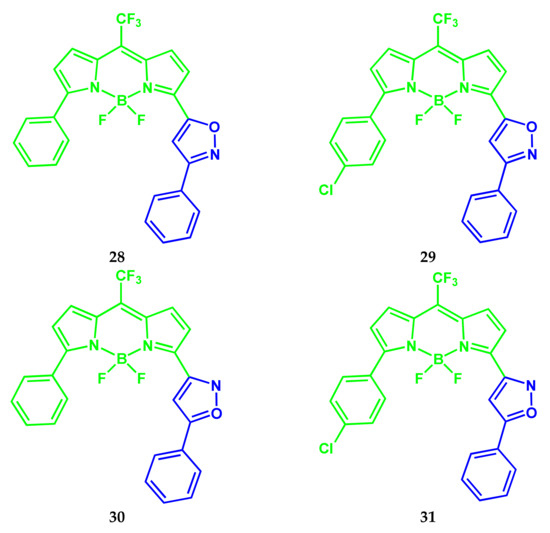 - Tomilin, D.N.; Sobenina, L.N.; Petrushenko, K.B.; Ushakov, I.A.; Trofimov, B.A. Design of novel meso-CF3-BODIPY dyes with isoxazole substituents. Dye. Pigment. 2018, 152, 14–18. [Google Scholar] [CrossRef]