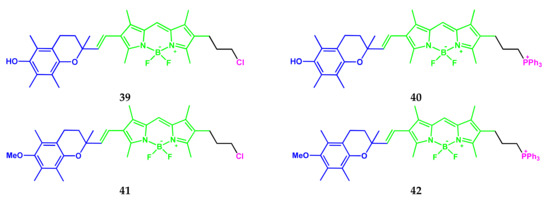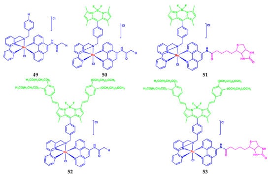 BODIPY-platinum(II) complexes 4 and 5 based on the O,O-donor monostyryl-substituted BODIPYs were developed [8] for photodynamic therapy in NIR light (600–720 nm) by targeting lysosomes (Scheme 3).