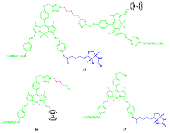 - Shi, W.-J.; Lo, P.-C.; Zhao, S.; Wong, R.C.H.; Wang, Q.; Fong, W.-P.; Ng, D.K.P. A biotin-conjugated glutathione-responsive FRET-based fluorescent probe with a ferrocenyl BODIPY as the dark quencher. Dalton Trans. 2016, 45, 17798–17806. [Google Scholar] [CrossRef]
