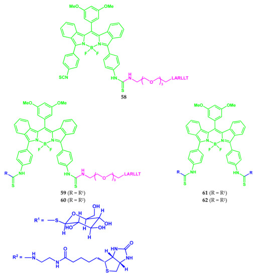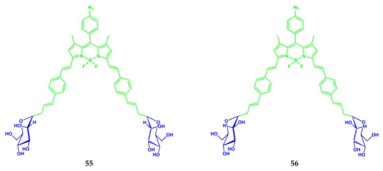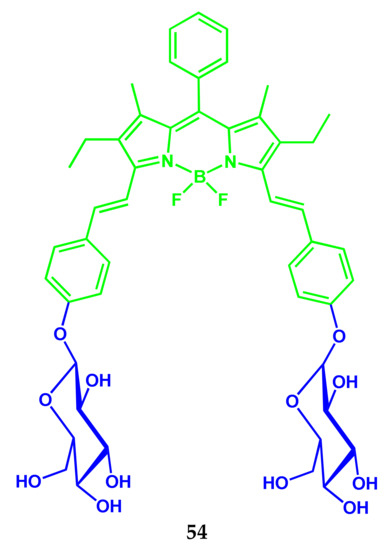 - Biagiotti, G.; Purić, E.; Urbančič, I.; Krišelj, A.; Weiss, M.; Mravljak, J.; Gellini, C.; Lay, L.; Chiodo, F.; Anderluh, M.; et al. Combining cross-coupling reaction and Knoevenagel condensation in the synthesis of glyco-BODIPY probes for DC-SIGN super-resolution bioimaging. Bioorg. Chem. 2021, 109, 104730. [Google Scholar] [CrossRef]