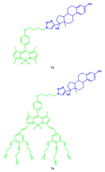 - Osati, S.; Ali, H.; Marques, F.; Paquette, M.; Beaudoin, S.; Guerin, B.; Leyton, J.V.; van Lier, J.E. BODIPY-17α-ethynylestradiol conjugates: Synthesis, fluorescence properties and receptor binding affinities. Bioorg. Med. Chem. Lett. 2017, 27, 443–446. [Google Scholar] [CrossRef]