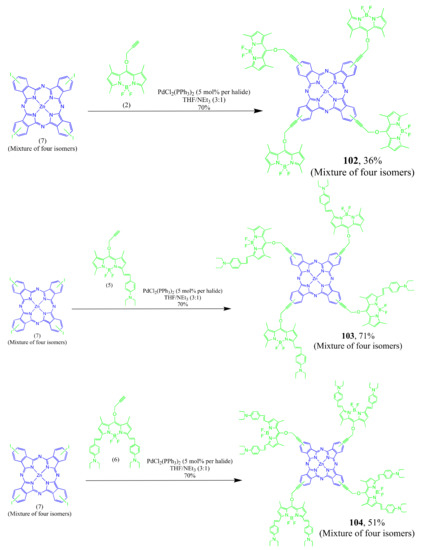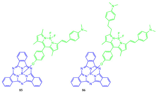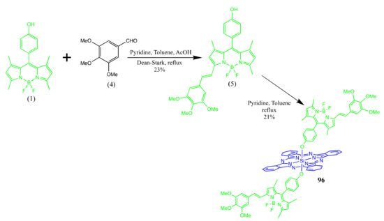 - Göl, C.; Malkoç, M.; Yeşilot, S.; Durmuş, M. A first archetype of boron dipyrromethene-phthalocyanine pentad dye: Design, synthesis, and photophysical and photochemical properties. Dalton Trans. 2014, 43, 7561–7569. [Google Scholar] [CrossRef]