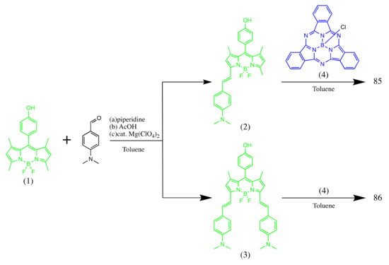 - Çetindere, S.; Çoşut, B.; Yeşilot, S.; Durmuş, M.; Kılıç, A. Synthesis and properties of axially BODIPY conjugated subphthalocyanine dyads. Dye. Pigment. 2014, 101, 234–239. [Google Scholar] [CrossRef]