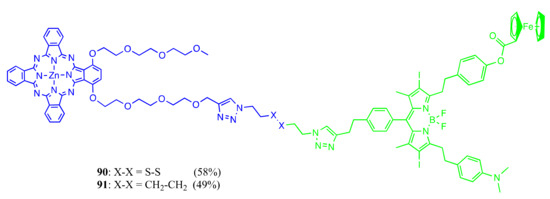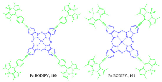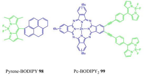 - Liu, J.-Y.; Ermilov, E.A.; Röder, B.; Ng, D.K.P. Switching the photo-induced energy and electron-transfer processes in BODIPY-phthalocyanine conjugates. Chem. Commun. 2009, 12, 1517–1519. [Google Scholar] [CrossRef]