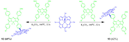 - Zhou, J.; Gai, L.; Zhou, Z.; Yang, W.; Mack, J.; Xu, K.; Zhao, J.; Zhao, Y.; Qiu, H.; Chan, K.S.; et al. Rational design of emissive NIR-absorbing chromophores: Rh(III) porphyrin-aza-BODIPY conjugates with orthogonal metal-carbon bonds. Chemistry 2016, 22, 13201–13209. [Google Scholar] [CrossRef]