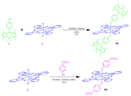 - Kaya, E.N.; Köksoy, B.; Yeşilot, S.; Durmuş, M. Purple silicon(IV) phthalocyanine axially substituted with BODIPY groups. Dye. Pigment. 2020, 172, 107867. [Google Scholar] [CrossRef]