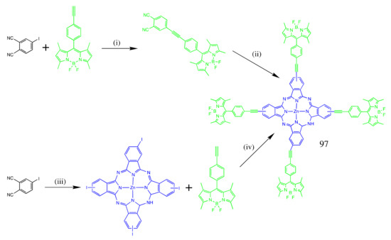 - Yanık, H.; Göksel, M.; Yeşilot, S.; Durmuş, M. Novel phthalocyanine–BODIPY conjugates and their photophysical and photochemical properties. Tetrahedron Lett. 2016, 57, 2922–2926. [Google Scholar] [CrossRef]