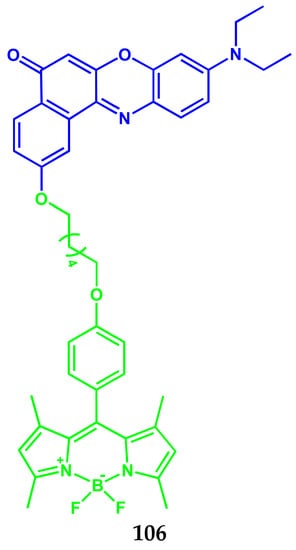 A bimodal fluorescent Nile Red-BODIPY probe 106 sensitive to the microenvironment for the simultaneous detection of the local polarity and viscosity of endoplasmic reticulum in living cells was synthesized [73] (Scheme 56).