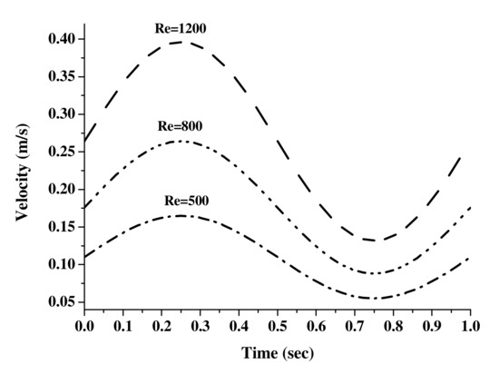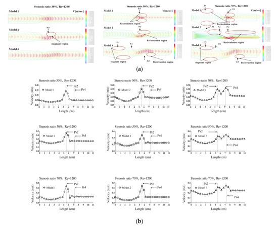 Figure 2a,b show the velocity distribution and average velocity in the pulsatile flow field based on changes to the stenosis ratio at each point of the modules. The vortex was partially formed as the stenosis rate increased during diastole, and then the recirculation region and stagnant layer were formed. Especially when the stenosis rate was 70%, the velocity distribution was very complex and a biased flow was shown. The location for the recirculation region and stagnant layer was shown variously based on the shape of the stenosis. When the stenosis rate was 70%, the velocity distribution was biased on one side with increasing the Reynolds number and the recirculation region was formed near the wall of the blood vessel after Ps3 (in