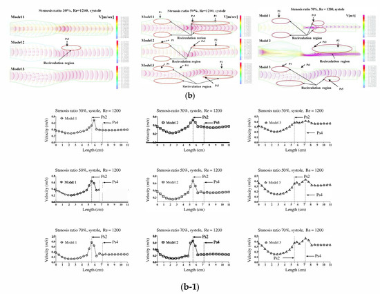 Figure 2a). It was found that the recirculation region was formed in models 1 and 2 ahead of the stenosis with increasing the stenosis rate and the Reynolds number. It is thought that this phenomenon was caused by the reverse flow of blood due to the decelerating force reducing the amount of blood flow near the Ps1 in which the diameter of blood vessel was decreased. After Ps3, the vortex rapidly developed as the stenosis rate and Reynolds number increased. Thus, it was found that a bigger recirculation region was formed. However, during systole, the velocity distribution was similar to the results of a continuous flow. In the case of a low stenosis rate, model 1 showed the relatively smooth flow, and models 2 and 3 showed the occurrence of a recirculation region ahead of the Ps1 region. In regions before and after Ps2, flow disturbance such as flow separation and vortex occurred and the asymmetry of the stenosis shape had a big impact on this flow disturbance. In the entire regions, the velocity of blood flow was lowered and the vortex was formed in the wall of the blood vessel. In this phenomenon, the range of occurrence of the vortex was increasing with an increase in the Reynolds number and stenosis rate. In model 3, it was found that the center part of the recirculation flow formed in the region ahead of Ps1 and moved to the entrance region with an increase in the Reynolds number. In models 1 and 2, Ps2 showed the highest velocity during diastole, but the average velocity during systole was similar to the results of the continuous flow. Ps2 showed the highest velocity in Models 1 and 2, and Ps4 showed the highest velocity in model 3. The average velocity decreased linearly from the entrance region to Ps1, but it tended to be increased after that. The lowest velocity was shown at P1. With the same stenosis rate, it was found that this tendency became worse as the Reynolds number increased.