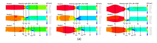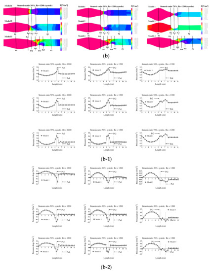 Figure 4 shows the pressure distribution, the average pressure, and pressure drop in the pulsatile flow field based on changes to the stenosis ratio at each point of the modules. When the stenosis rate was 30% during diastole, the average pressure was the lowest in the entrance region and it was the highest in the exit region. In the case of a low stenosis rate, the average pressure generally had a negative value. High pressure was shown in the region ahead of Ps1 with an increasing stenosis rate and Reynolds number. When the stenosis rate was more than 70%, it was found that the pressure drop was increasing with an increasing Reynolds number. The average pressure during systole was similar to the result of a continuous flow and its value was relatively high. Changes in pressure in the blood vessel were gradually increasing until it reached the Ps1, and it rapidly decreased at Ps1. The lowest value was shown at Ps2 in models 1 and 2 and it was shown at Ps4 in model 3. The maximum pressure was shown at P1 in models 1 and 2 and it was shown at Ps1 in model 3. In the case of a low stenosis rate, the pressure tended to be increasing after Ps3 and then decreasing. When the stenosis rate was more than 50%, the pressure distribution was significantly changed in the region ahead of Ps1 with an increasing Reynolds number during diastole. For the pressure distribution during systole, it was found that a significantly high pressure was shown in all regions of the stenosis and the minimum pressure was shown in the stenosis region.