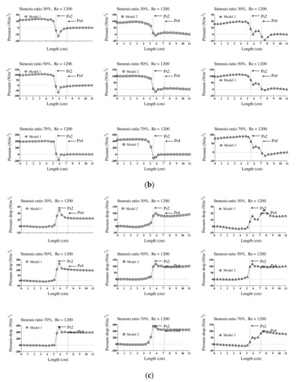 Figure 3 shows the pressure distribution, the average pressure, and pressure drop in the continuous flow field based on changes to the stenosis ratio at each point of the module. The average pressure increased linearly from the entrance region to Ps1, but it rapidly decreased after Ps1. A minimum value was shown in Ps2, but the pressure was not changed after Ps3. In Model 1, when the stenosis rate was 70% and Reynolds number was 1200, the maximum velocity was approximately 13 times higher than when the stenosis rate was 30%. It was approximately 5.5 times higher than that in model 2. It was approximately 4.5 times higher than that in model 3. In the case of model 1 with symmetric stenosis, as the stenosis rate increased, the maximum pressure was shown in the region ahead of Ps1. As the Reynolds number and stenosis rate increased, a significant change in pressure was shown.