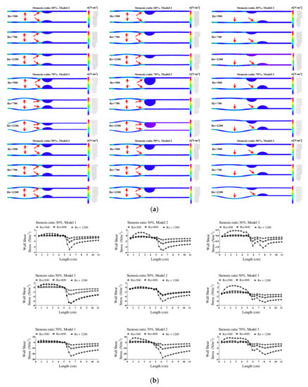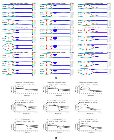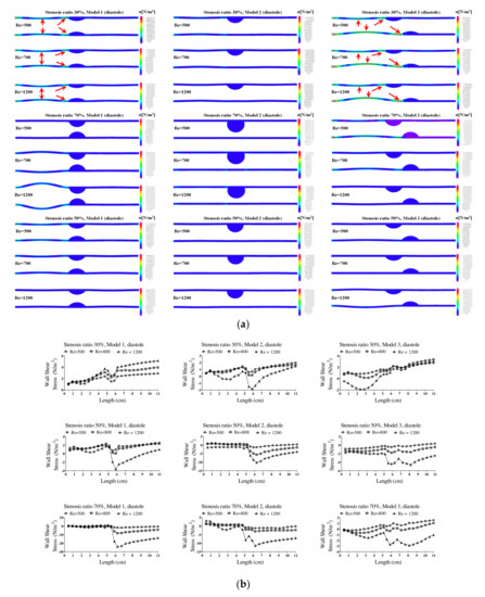 Figure 6 shows the wall load distribution and wall shear stress (WSS) on the wall of the blood vessels in the pulsatile flow field based on changes to the stenosis ratio at each point of the modules. In this figure, the WSS implies the hemodynamic force acting on the inner wall of the blood vessel due to the pulsatile flow field in blood vessel. When the stenosis rate was 30% during diastole, the minimum shear stress was shown at P1 in models 1 and 3 and it was shown at Ps2 in model 2. In addition, the minimum shear stress was moving toward the entrance region with an increasing Reynolds number in model 3. When the stenosis rate was 70%, the shear stress was significantly changed in the region after Ps2 with an increasing Reynolds number. The WSS on the wall of the blood vessel during systole showed the highest changes in shear stress in model 1 and the lowest changes in shear stress in model 3. Changes in shear stress were increasing with an increasing Reynolds number. High shear stress was shown in the region ahead of Ps1 and it had a negative value in the region after Ps1. The maximum shear stress was increased with an increasing stenosis rate and Reynolds number, and the minimum shear stress was decreased. P1, in which maximum shear stress was formed, was predicted to be the region where the structure of the wall of the blood vessel was likely to be changed. This region is thought to be the stagnation point of blood, in which platelets, which are a blood parameter, begin to be deposited on an internal wall of the blood vessel and cause the blood clots to form. Platelets, which receive high shear stress, were stagnant at P1 due to the recirculation vortex; they are more likely to be attached to the wall of a blood vessel with increasing time. In these regions, the formation of blood clots is prone to occur, and an aneurysm is frequently formed in regions where blood clots are formed on an internal wall of a blood vessel [