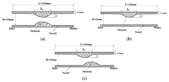 7]. In all models, points where the maximum shear stress was formed were almost same, but the points where the minimum shear stress was formed were shown differently. Asymmetry of the stenosis shape was found to have a big impact on changes in shear stress.