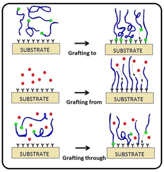 - Hansson, S.; Trouillet, V.; Tischer, T.; Goldmann, A.S.; Carlmark, A.; Barner-Kowollik, C.; Malmström, E. Grafting efficiency of synthetic polymers onto biomaterials: A comparative study of grafting-from versus grafting-to. Biomacromolecules 2012, 14, 64–74. [Google Scholar] [CrossRef]