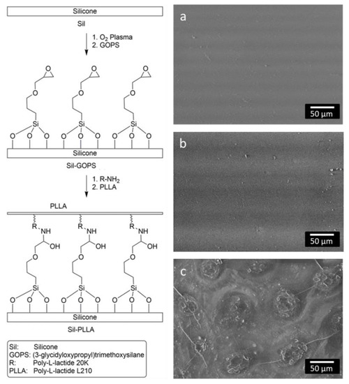 Left: General reaction scheme for the coating of silicone surfaces (Sil) with PLLA via the cross linker GOPS (Sil-GOPS) and the PLLA functionalized with amino groups (Sil-PLLA); Right: representative SEM micrographs of Sil (a); Sil-GOPS (b) and Sil-PLLA (c) surfaces.