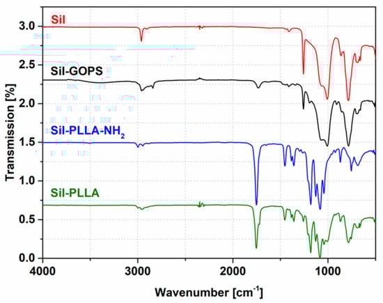 FTIR spectra of investigated Sil based samples Sil, Sil-GOPS, Sil-PLLA-NH2, Sil-PLLA in the range of 4000–500 cm−1. The prominent band between 1764–1712 cm−1 corresponds to PLLA signals.