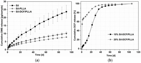 As shown in Figure 4a, the DMS release is influenced by the addition of the PLLA coating. For the uncoated silicone samples, the released amounts of DMS are significantly higher compared to the coated samples. Around 24 µg DMS was released after 92 days, in contrast to the coated samples where 7 to 10 µg DMS was released in the same amount of time. Furthermore, the additionally incorporated DCF in the PLLA coating (Sil-DCF/PLLA) increases the DMS release significantly from day 1 compared to the other coated samples.