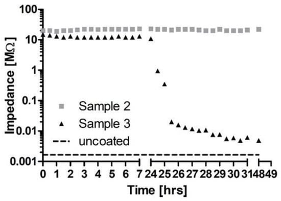Impedance development over time on two contacts, both coated with 5 µm PLLA. Electrical stimulation started right after the 24 h measurement. The dashed horizontal line indicates mean impedance values of uncoated contacts (N = 6).