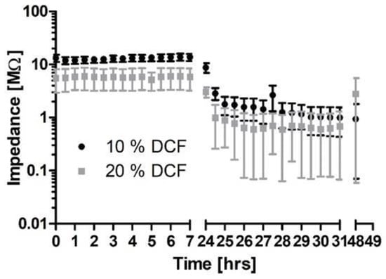 Mean (± SEM) impedance values as measured for contacts coated with PLLA and loaded with 10% or 20% DCF. All measurements from t = 0 to 24 h were performed with the samples being immersed in 0.9% NaCl. Between all later measurements, contacts were electrically stimulated (N = 8).