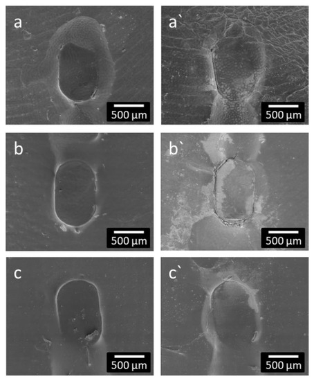 All samples were also examined for morphological changes after impedance measurements. As shown in Figure 8, for each coating thickness of 2.5, 5 and 10 µm, undamaged coating around the platinum contacts (Figure 8a–c) and platinum contacts with cracks and erosion of the coating (Figure 8a`–c`) were found.