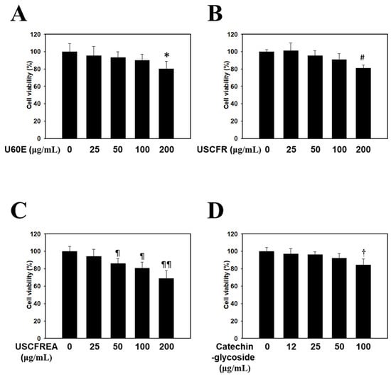 Endogenous cytotoxicity of Ulmus extract fractions and catechin-glycoside in HDFPCs. Cells were incubated with the indicated doses of (A) U60E, (B) USCFR, (C) USCFREA, and (D) catechin-glycoside (μg/mL, w/v). Cell viability was calculated as described in Materials and Methods. Data are expressed as the mean ± SD. * p < 0.05, # p < 0.05, ¶ p < 0.05, ¶¶ p < 0.01, and † p < 0.05 vs. the untreated group.