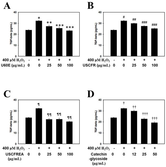 Inhibitory effect of Ulmus extract fractions on oxidative−stress−induced TGF−β production. Cells were pre−incubated with the indicated doses of (A) U60E, (B) USCFR, (C) USCFREA, and (D) catechin−glycoside (μg/mL, w/v) and treated with H2O2 for 12 h. TGF−β production was measured as described in Materials and Methods. Data are expressed as the mean ± SD. * p < 0.05, # p < 0.05, ¶ p < 0.05 and † p < 0.05 vs. normal group (blank). ** p < 0.05, *** p < 0.005, ## p < 0.05, ### p < 0.01, ¶¶ p < 0.005, †† p < 0.05 and ††† p < 0.001 vs. control group (H2O2 treated only).