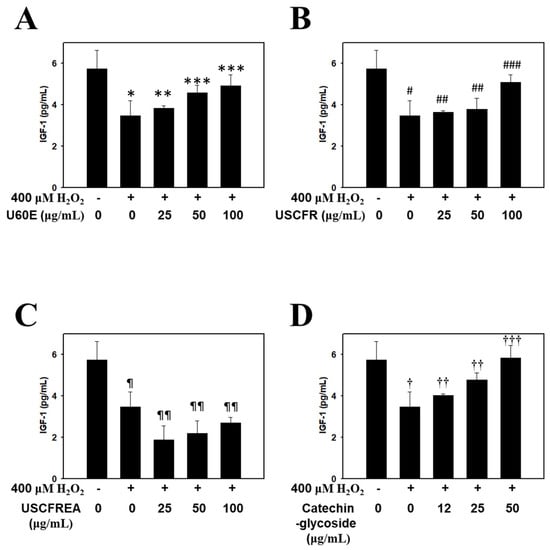 Recovery effects of Ulmus extract fractions on oxidative−stress−induced IGF−1 formation. Cells were pre-incubated with the indicated doses of (A) U60E, (B) USCFR, (C) USCFREA, and (D) catechin−glycoside (μg/mL, w/v) and treated with H2O2 for 12 h. IGF−1 production was measured as described in Materials and Methods. Data are expressed as the mean ± SD. * p < 0.05, # p < 0.05, ¶ p < 0.05 and † p < 0.05 vs. normal group (blank). ** p < 0.05, *** p < 0.01, ## p < 0.05, ### p < 0.01, ¶¶ p < 0.005, †† p < 0.05 and ††† p < 0.001 vs. control group (H2O2 treated only).