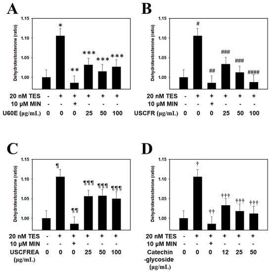 Inhibitory effect of Ulmus extract fractions on DHT production. Cells were pre−incubated with the indicated doses of (A) U60E, (B) USCFR, (C) USCFREA, and (D) catechin−glycoside (μg/mL, w/v) and treated with testosterone for 12 h. The DHT content (pg/mL) in cell lysates was measured according to the manufacturer’s instruction. Data are expressed as the mean ± SD. * p < 0.05, # p < 0.05, ¶ p < 0.05 and † p < 0.05 vs. normal group (blank). ** p < 0.005, *** p < 0.01, ## p < 0.005, ### p < 0.01, #### p < 0.001, ¶¶ p < 0.005, ¶¶¶ p < 0.05, †† p < 0.005 and ††† p < 0.01 vs. control group (T, testosterone treated only). MIN—minoxidil, TES—testosterone.