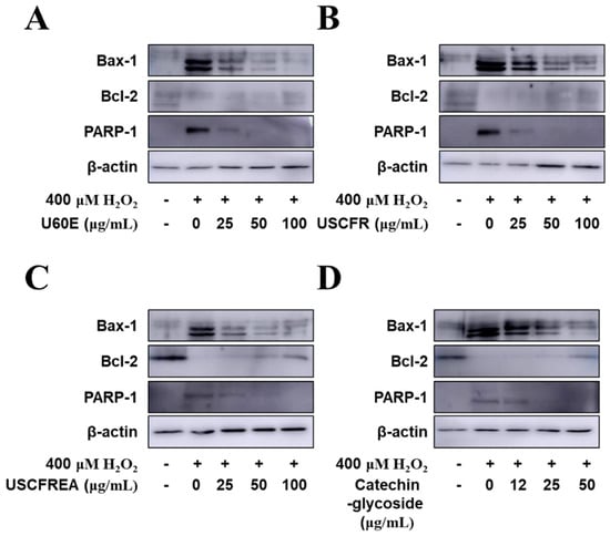 Cell protein extracts were prepared fresh before use as follows: cells (1 × 105 cells) were pre-incubated with (A) U60E, (B) USCFR, (C) USCFREA, and (D) catechin-glycoside (μg/mL, w/v) at various concentrations or in control media for 10 min at 37 °C in a CO2 incubator. Then, the cells were treated with H2O2 (final concentration, 400 μM) and further incubated for 12 h. Then, harvested cells were solubilized by mixing with ice-cold lysis buffer (20 mM Hepes (pH 7.2), 1% Triton X-100, 10% glycerol, 1 mM EDTA, 1 mM phenylmethylsulfonyl fluoride, 50 mM NaF, 1 mM Na3VO4, leupeptin (10 mg/mL), pepstatin (10 mg/mL), and aprotinin (10 mg/mL)) by repeated trituration with a micropipette. The samples were then incubated for 1 h at 4 °C. Supernatants were obtained after centrifugation at 20,000× g for 10 min. The concentration of the extracted proteins in the supernatant was determined by the Bradford assay with bovine serum albumin (BSA) as a protein standard. Proteins at equivalent micrograms per lane were resolved by 7–12% sodium dodecyl sulfate-polyacrylamide gel electrophoresis (SDS-PAGE) and electrotransferred to polyvinylidene difluoride membranes (GE Healthcare, Brookfield, WI, USA) [41]. Antibodies against Bax, Bcl-2, PARP, and β-actin were used. Horseradish peroxidase-conjugated secondary antibodies (Santa Cruz Biotechnology, Santa Cruz, CA, USA) were used and the reactions were visualized by enhanced chemiluminescence. All immunoreactive signals were analyzed by densitometric scanning (LAS500, GE Healthcare, Brookfield, WI, USA).