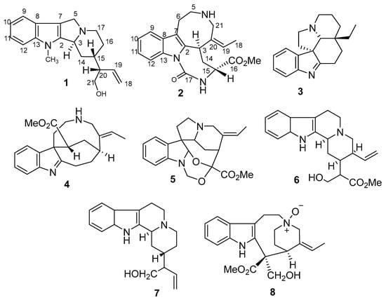 Monoterpenoid indole alkaloids (MIAs) are an interesting class of naturally bioactive metabolites originating from the coupling of an indole-containing nucleus (i.e., tryptophan) and a monoterpenoid derivative (e.g., secologanin) [6,7]. MIAs are common compounds isolated from Apocynaceae, Rubiaceae, and Loganiaceae. Monoterpenoid indole alkaloids were reported to display anti-cancer, anti-inflammatory, analgesic, spasmolytic, insecticidal effects [8]. For example, ajmalicine and reserpine reported from the Apocynaceae plant, Rauwolfia serpentina, exhibited cardiopathy and antihypertensive activities. Additionally, camptothecin isolated from Camptotheca acuminate and vincristine and vinblastine isolated from Catharanthus roseus exhibited potent antitumor activity [9,10,11,12]. The dimeric molecule, vinblastine, with the commercial name Vinblastine®, is applied solely or in combination with other drugs for the treatment of choriocarcinoma and breast carcinoma besides their curation effect on Kaposi’s sarcoma, lymphomas, Hodgkin’s disease, and advanced carcinoma of the testis. The other dimeric monoterpenoid indoles, vincristine, which is marketed under the name, Oncovin, is used in combination with other anticancer drugs for the treatment of Hodgkin’s disease, lymphoma, acute leukemia, carcinoma, and sarcoma [13,14].