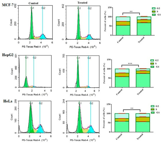 Effect of compound 2 on cell cycle phases of MCF-7, HepG2 and HeLa cells. Cell cycle distribution was determined using DNA cytometry analysis after exposure to 2 for 48 h. Data are presented as the mean ± SD; n = 3; ** p < 0.01 and *** p < 0.001.