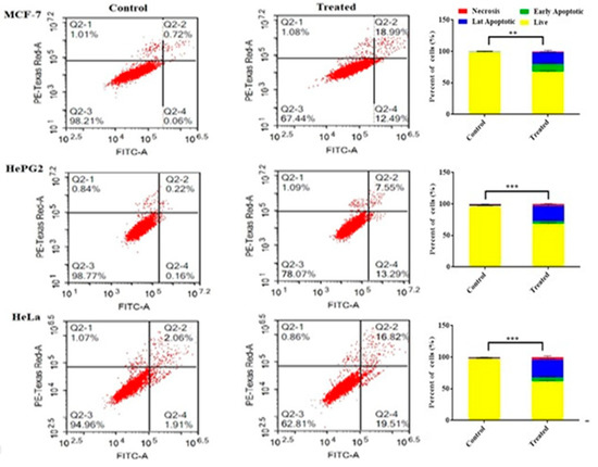 Apoptosis/necrosis assessment for compound 2 against MCF-7, HepG2, and HeLa cells subjected to previous treatment for 48 h, and apoptosis/necrosis quantified using flow cytometry. Data are presented as the mean ± SD; n = 3; ** p < 0.01 and *** p < 0.001.