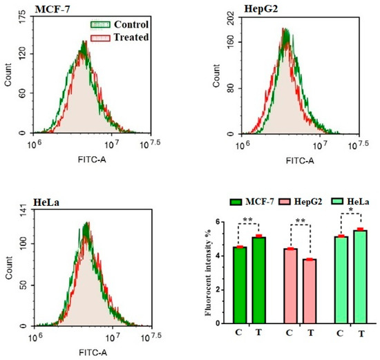MCF-7, HepG2, and HeLa cells were treated with compound 2 for 48 h, trypsinized, and washed twice with PBS. Apoptosis assessment was carried out via the Annexin V-FITC/PI Apoptosis Detection Kit, BD Biosciences, San Diego, USA, as stated by the manufacturer. In brief, cells were resuspended in 0.5 mL of binding buffer then 5 μL of Annexin V-FITC and 5μL of PI (staining solution) were added for 15 min at room temperature in a dark place. Finally, the cells were applied to FACS analysis using ACEA Novocyte™ flow cytometer, ACEA Biosciences Inc., San Diego, CA, USA, within one hour following staining, cell cycle distribution is calculated using ACEA. Novo Express™ software (ACEA Biosciences Inc., San Diego, CA, USA) [28].
