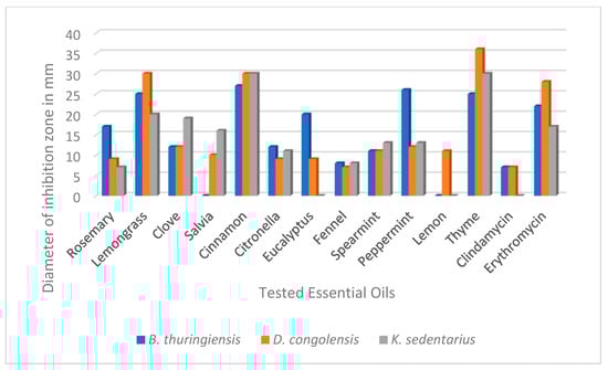 The antibacterial efficacy of 12 EOs showed marked differences using the drop plate method (Figure 1). Based on the diameter (20–36 mm) of the inhibition zones, thyme, cinnamon and lemongrass were the most effective antibacterial EOs against all three investigated bacterium species. Other EOs differed in their efficacies against the different species. Lemon was effective only against D. congolensis while salvia only against K. sedentarius and D. congolensis, and eucalyptus against B. thuringiensis and D. congolensis. From the bacterial point of view, the most sensitive bacterium was D. congolensis, as all EOs had some inhibitory effect on this species (Figure 1).