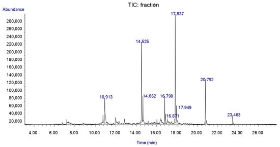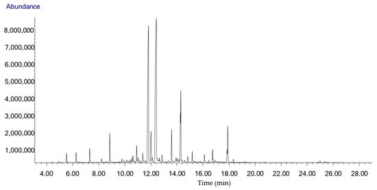 The analyses were carried out with an Agilent 6890N/5973N GC-MSD (Santa Clara, CA, USA) system equipped with a Supelco (Sigma-Aldrich, Philadelphia, PA, USA) SLB-5MS capillary column (30 m × 250 µm × 0.25 µm). The GC oven temperature was programmed to increase from 60 °C (3 min isothermal) to 250 °C at 8 °C/min (1 min isothermal). High purity helium (6.0) was used as a carrier gas at 1.0 mL/min (37 cm/s) in constant flow mode. The mass selective detector (MSD) was equipped with a quadrupole mass analyser and was operated in electron ionization mode at 70 eV in full scan mode (41–500 amu at 3.2 scan/s). The data were evaluated using MSD ChemStation D.02.00.275 software (Agilent, Santa Clara, CA, USA). The identification of the compounds was carried out by comparing retention data and recorded spectra with the literatury data, and the NIST 2.0 library was also consulted. The percentage evaluation was carried out by area normalization.