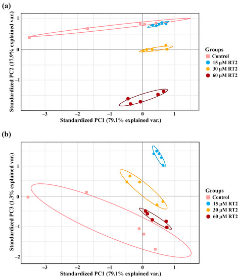 The biplot-principal component analysis (PCA) showing (a) PC1 vs. PC2 and (b) PC1 vs. PC3 of the Caco-2 proteome. The groups of datasets that are close together are highly correlated in terms of the protein expression profile for each condition. On the other hand, the groups of datasets that are far apart are less correlated. Different groups are indicated by circles, including the untreated control group, and 15, 30, and 60 µM of RT2 peptide-treated groups. Each point corresponds to a different experimental repeat.