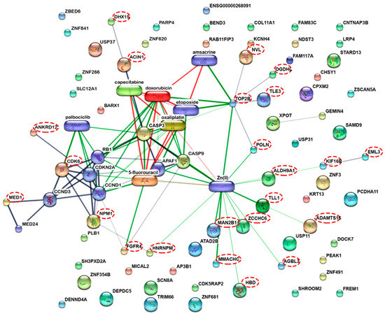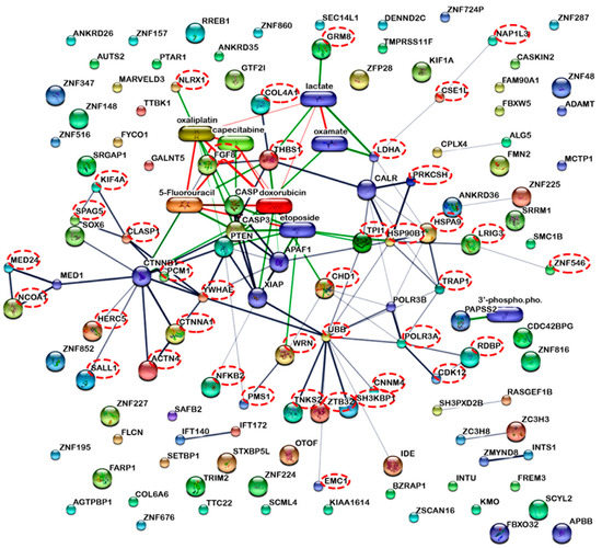 The interaction of the 79 proteins that were enhanced in their expression in a comparable way to late and total apoptosis levels and those that are predicted to associate with anticancer drugs (e.g., doxorubicin, oxaliplatin, 5-fluorouracil, and capecitabine) or apoptotic proteins (e.g., caspase 3 and caspase 9) using the STITCH version 5.0 software. The dashed circles indicate the filtered proteins from the proteomics dataset that interact with anticancer drugs and apoptotic proteins.