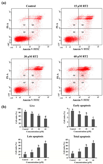 Annexin V-FITC/PI double staining coupled with flow cytometry revealed RT2 induces apoptosis in Caco-2 colon cancer cells. Cells were treated or not with increasing concentrations of RT2 (15, 30, and 60 µM) for 24 h. (a) The flow cytometry histograms indicate that RT2 treatment leads to an increase in the number of Caco-2 apoptotic cells. Live cells are in quadrant 3 (Q3, Annexin V-FITC negative and PI negative). Early apoptotic cells are in quadrant 4 (Q4, Annexin V-FITC positive and PI negative). Late apoptotic cells are in quadrant 2 (Q2, Annexin V-FITC positive and PI positive). Necrotic cells are in quadrant 1 (Q1, Annexin V-FITC negative and PI positive). (b) The bar chart quantifies the percentage of live, early, late, and total apoptotic cells. These data are represented as mean ± SD. Different letter(s) on the top of each bar are statistically different from each other (p < 0.05, n = 3).