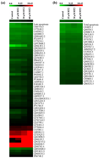 The MeV software was used to find proteins from Caco-2 proteomics data that are upregulated and involved in apoptosis upon RT2 treatment. The cluster resulted from SOTA analysis demonstrated that an increase in expression levels of 55 proteins in RT2-treated Caco-2 cells was comparable to late apoptosis levels, while 24 proteins were correlated with total apoptosis levels as determined by flow cytometry (Table S3). The heatmap representing the hierarchical cluster analysis of the relative expression level of these proteins is shown in Figure 6. The shades of green to red indicated changes in protein expression levels from low to high when Caco-2 cells were treated with 0, 15, 30, and 60 µM of RT2.