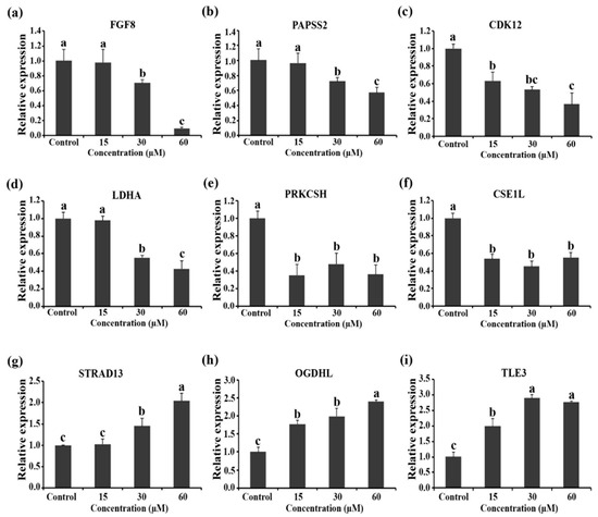 RT-qPCR results for untreated control and RT2-treated Caco-2 cells (15, 30, and 60 µM) after 24 h. (a–f) show downregulated expression of FGF8, PASS2, CDK12, LDHA, PRKCSH, and CSE1L genes, respectively. (g–i) show upregulated expression of STRAD13, OGDHL, and TLE3 genes, respectively. These data are represented as mean ± SD. Different letter(s) on the top of each bar show the statistical differences from each other (p < 0.05, n = 3).