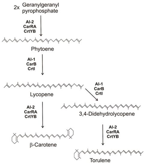 104. Li, C.; Swofford, C.A.; Sinskey, A.J. Modular engineering for microbial production of carotenoids. Metab. Eng. Commun. 2020, 10, e00118. [Google Scholar] [CrossRef] [PubMed]