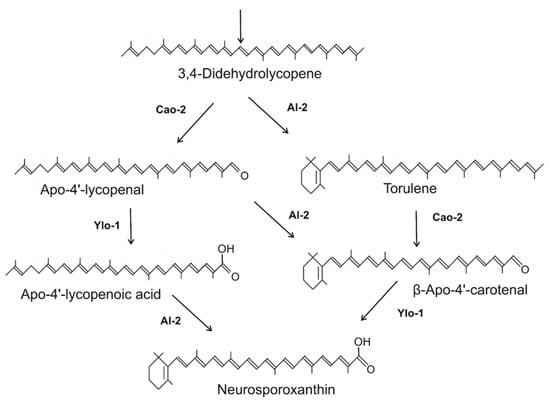 33. Saelices, L.; Youssar, L.; Holdermann, I.; Al-Babili, S.; Avalos, J. Identification of the gene responsible for torulene cleavage in the Neurospora carotenoid pathway. Mol. Genet. Genom. 2007, 278, 527–537. [Google Scholar] [CrossRef] [PubMed]