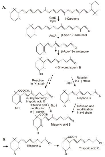 Figure 6. Synthesis of trisporic acids from β-carotene by interactions of different mating types in Mucoraceae. (A) Pathway to trisporic acid B; (B) Final step in trisporic acid C formation.