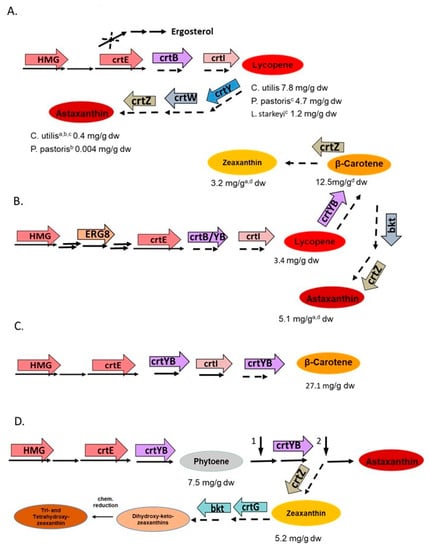 Different non-carotenogenic yeasts were genetically engineered for carotenoid biosynthesis [80]. This started with the transformation of Candida utilis with bacterial genes to establish the pathway to astaxanthin. The genes used were crtB for phytoene synthesis, crtI for phytoene desaturation to lycopene, crtY for cyclisation to β-carotene, and crtW together with crtZ for β-carotene ketolation and hydroxylation to astaxanthin (Figure 7A), which yielded 0.4 mg/g dry weight of astaxanthin [81]. The next-generation of recombinant C. utilis strains were modified in key metabolic steps by over expression of the gene for HMG-CoA reductase, HMG, which is the limiting enzyme for the entire terpenoid pathway [82]. In addition, one of two alleles of the squalene synthase gene was inactivated together with over expression of the geranylgeranyl pyrophosphate synthase gene crtE to re-direct metabolite flow from the sterol pathway into carotenoids (Figure 7A). This resulted in an increase of lycopene to 7.8 mg/g dw. A similar genetic modification of the pathway to lycopene without inactivation of the squalene synthase gene was carried out in a similar way with Lipomyces starkeyi [80] and Pichia pastoris [83], reaching a lycopene concentration of 1.2 and 4.7 mg/g dw, respectively. With the same genes used for C. utilis, the carotenoid pathway was also extended to astaxanthin in P. pastoris, but only 0.004 mg/g dw were obtained [84].