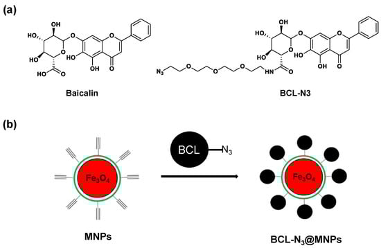 Assembling of baicalin functionalized magnetic nanoparticles (MNPs). (a) Chemical structure of baicalin and BCL-N3; (b) Schematics of magnetic nanoparticles modified with BCL-N3.