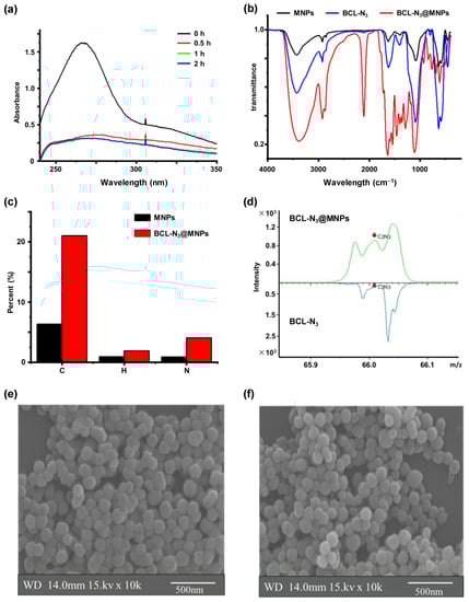 Characterization of BCL-N3@MNPs. (a) UV spectra of BCL-N3 in the supernatant of the reaction mixture of BCL-N3 with MNPs at various times; (b) IR spectra of BCL-N3, intact MNPs and BCL-N3@MNPs; (c) the percentage of different elements (C, H, N) in MNPs and BCL-N3@MNPs; (d) enlarged view of ToF-SIMS spectra of MNPs and BCL-N3@MNPs; (e,f) the SEM images of MNPs (e) and BCL-N3@MNPs (f).
